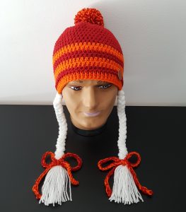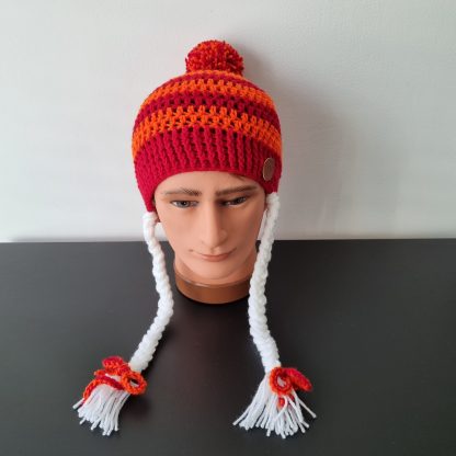 Deze muts is gemaakt in de kleuren rood/oranje. De kleuren van Kielegat (Breda) maar kan uiteraard ook in de door jouw gewenste kleur van jouw stad, dorp of carnavalsvereniging gemaakt worden.
